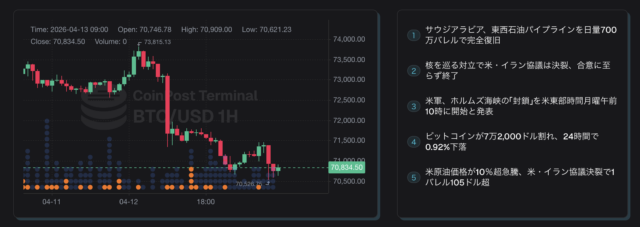 ビットコイン(BTC)は、12日から13日朝にかけて急落した。背景には、米国とイランによる14時間に及ぶ和平交渉が決裂したことに加え、その後、米軍がホルムズ海峡を逆封鎖するとの報道が伝わったことがある。