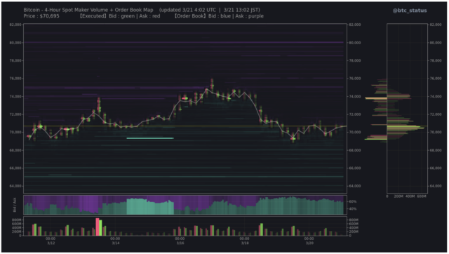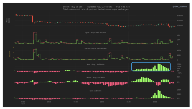 また、成行注文のフローを見ると、価格そのものは下落している一方で、本日未明にかけては現物市場を中心に比較的大きな買いが確認されている(下画像青枠)。外部環境の悪化によって価格は押し下げられているものの、現物主体の押し目買い意欲は一定程度残っている状況である。