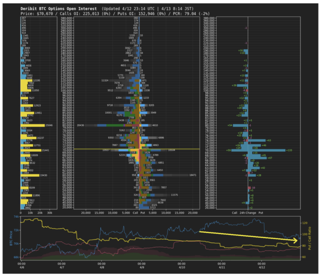オプション市場では、プット・コール・レシオ(PCR)が低下している(下画像黄矢印)。価格が下落しているにもかかわらずPCRが低下していることは、市場参加者が依然として先行きに対して強気姿勢を維持していることを示唆している。