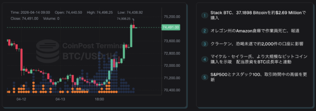 ビットコイン(BTC)は、13日夜から14日朝にかけて反発した。米国とイランの交渉が合意に至らず、さらに米軍がホルムズ海峡を逆封鎖するとの報道を受けて一時下落したものの、その後はトランプ米大統領とイランのモホセニエジェイ司法府代表の双方から、合意に向けた交渉継続が伝えられたことで、中東情勢を巡る過度な警戒感が後退し、相場は持ち直した。
