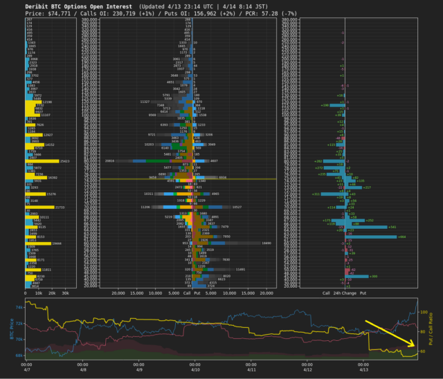 オプション市場では、PCR(プット・コール・レシオ)が低下している(下画像黄矢印)。これは、市場参加者のセンチメントが改善し、投資家心理が強気方向に傾いていることを示している。