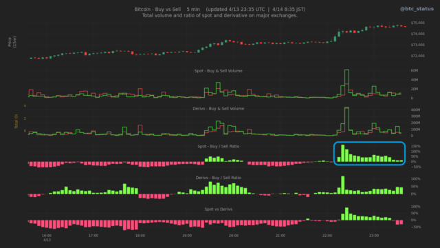 成行注文の内訳を見ると、本日未明には現物市場を中心に買いが入っており、今回の上昇が先物主導ではなく、現物主導で進んでいることが確認できる(下画像青枠)。