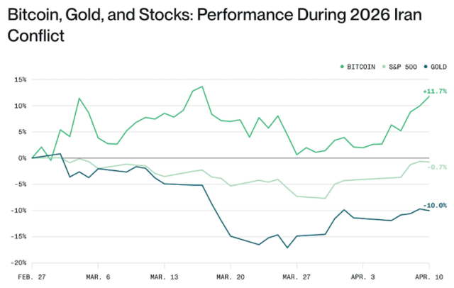 ビットワイズは以下のデータを添付し、2月27日の終値から4月10日の間にビットコインは約12%上昇したのに対し、米株価指数「S&P500」は約1%、ゴールド(金)は10%下落したと指摘している。