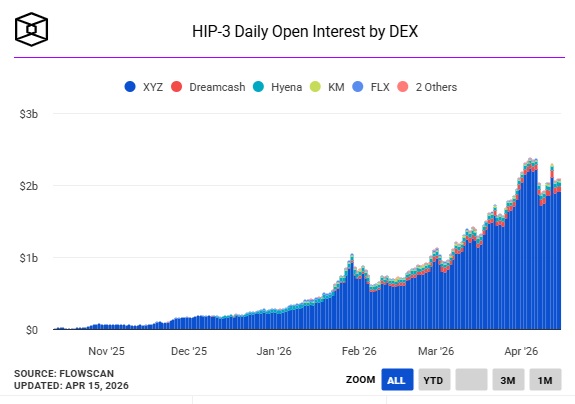 HIP-3は急成長しており、建玉残高は年初の約2億8,000万ドルから、1か月足らずで10億ドルを突破し、3月末には20億ドルに達した。年初来で約580%増加している格好だ。