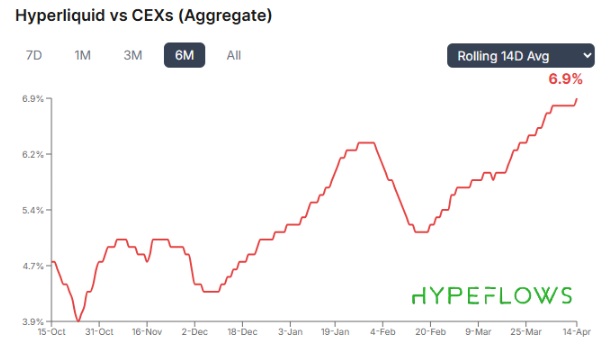 HypeFlowsのデータによると、ハイパーリキッドの取引量は、バイナンスなど中央集権型の仮想通貨取引所(CEX)における永久先物建玉の6.9%を占めるまでに成長した。