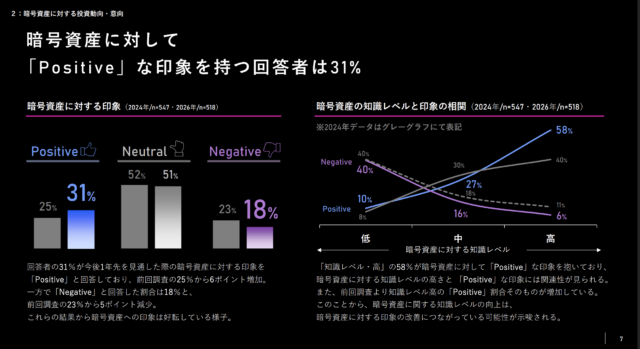 仮想通貨に対する今後1年間の見通しについて「ポジティブ」と回答した割合は31%で、前回2024年6月調査の25%から6ポイント上昇した。一方、「ネガティブ」との回答は23%から18%へと5ポイント低下し、全体的なセンチメントの改善が確認された。