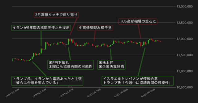 週初はトランプ米大統領がイランとの対話に前向きな姿勢を示したことや、同国が核開発の一時停止を提案したとの報道を受け、地政学リスクの後退期待から買いが優勢となり、相場は1190万円台まで水準を切り上げた。