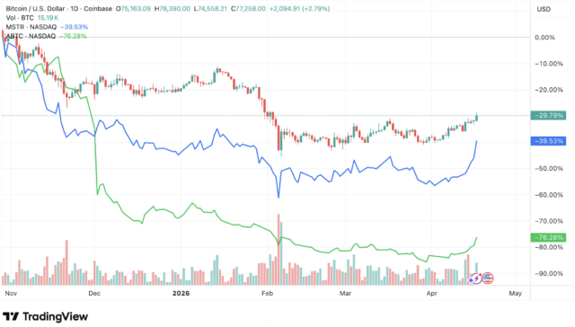 ビットコイン価格が7万8,000ドルまで上昇したことで、同資産を財務基盤に持つデジタル資産トレジャリー(DAT)銘柄にも資金が流入した。ABTCは15%、MSTRは11.8%、ASSTは11.6%の上昇をそれぞれ記録した。