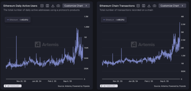 データによると、トランザクション数の急増はレイヤー2とステーブルコインの利用拡大が主因である。
