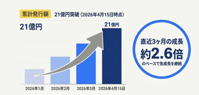 今回の発表によると、JPYCの事業状況は好調であり、2026年4月時点での累計発行額は21億円を突破し、直近3ヶ月で2.6倍という驚異的な成長を記録している。