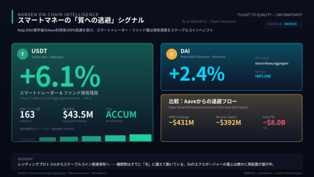 深刻だったのは、価格下落だけではない。問題の本質は、売りたくても売れない、引き出したくても引き出せないという流動性の枯渇である。Nansen APIなどを用いたウォレット分析でも、Kelp DAO事件直後に、暗号資産をステーブルコインへ交換し、DeFiから退避する動きが広がったことがうかがえる。