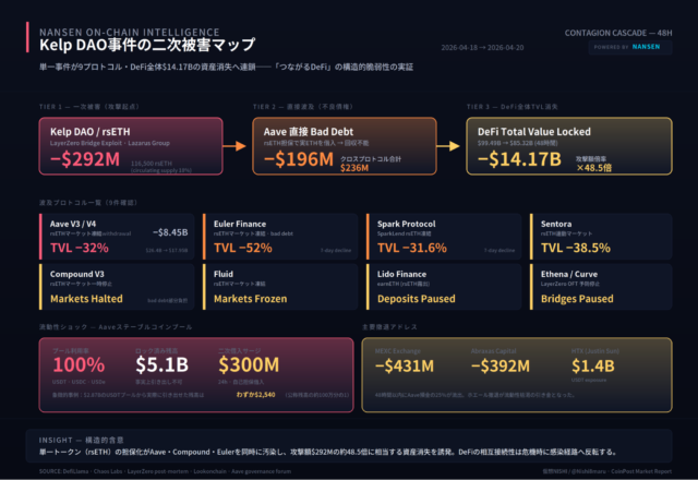 今回、市場へのインパクトが特に大きかったのは、Kelp DAO事件後のAave周辺の混乱である。Aave自体が直接攻撃を受けたわけではない。それにもかかわらず、大口資金の引き揚げが連鎖し、DeFi市場全体から約2兆円規模の資金が逃避した。短期間でTVLが大きく縮小し、オンチェーン版の取り付け騒ぎが現実のものとなった。