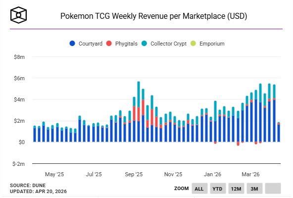 トークン化ポケモンカード市場の週間収益は、4月6日までの週に538万ドル(約8.5億円)に達し、2025年9月に記録した過去最高値570万ドルに迫った。