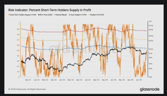 同レポートは、過去の統計上、短期保有者の含み益比率が54%を超えると利益確定売りが集中し、上昇が頭打ちになる傾向があると指摘する。