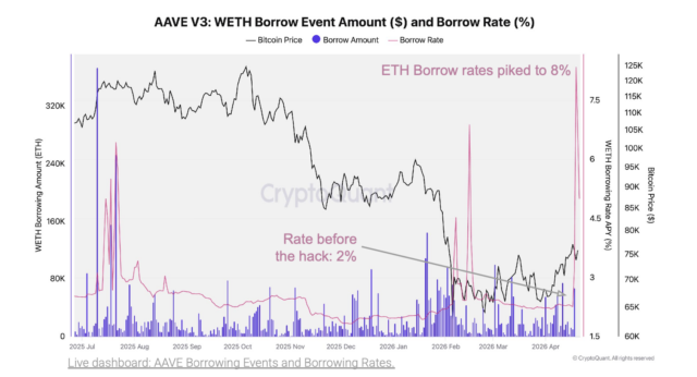 オンチェーン分析会社クリプトクアントも同日、ケルプDAOのハックがDeFi全体で急激な流動性逼迫と借入金利の急騰を引き起こしたと報告している。