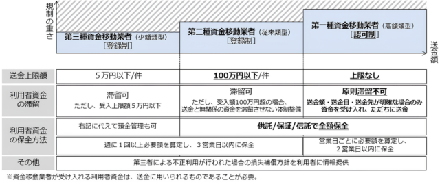 - 第一種(高額類型):送金上限なし、許可制、利用者資金の原則滞留不可
