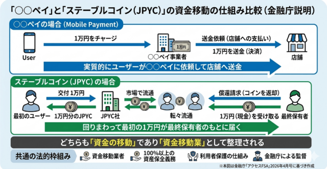 金融庁は2026年4月、職員が金融規制の実務を解説する連載企画「アクセスFSA」の中で、国内初の円建てステーブルコイン発行事業者であるJPYCを「資金移動業者」として資料でも公式に位置づけた。PayPayや楽天ペイなど「○○ペイ」系サービスと同じ法的枠組みで監督されていることが、一次資料として明確に示された形だ。