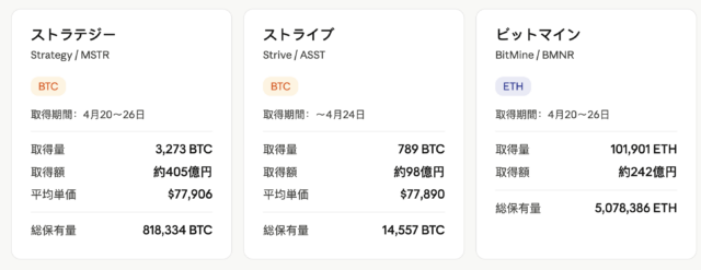 また、ストライブ(Strive)は789BTCを約6,143万ドル(約98億円)で取得したと、CEOのマット・コール氏が4月27日にXで明らかにした。1BTCあたりの平均取得価格は約7万7,890ドルで、4月24日時点の保有量は14,557BTCとなった。