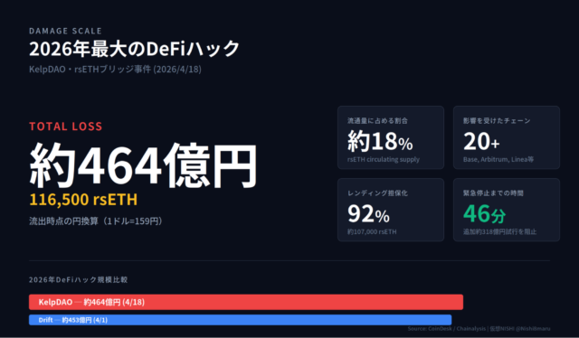 2026年4月18日夜(UTC)、リキッドリステーキング(LRT)プロトコル「Kelp DAO」のクロスチェーンブリッジから、約464億円相当の116,500 rsETHが流出した。流通量の約18%にあたる規模であり、年初来最大級のDeFiハック、そして2026年に発生した暗号資産関連事件としても現時点で最大規模の被害である。