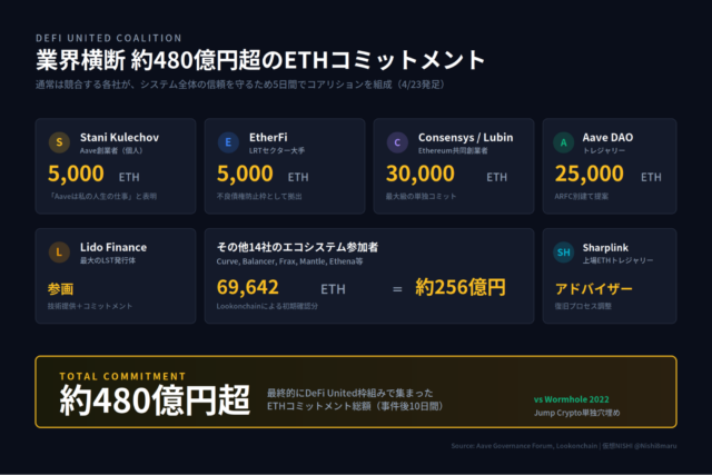 4月23日、Aaveの関係者を中心に「DeFi United」と呼ばれる支援体制が立ち上がった。Aave、EtherFi、Lido、Consensysなど、DeFiの主要プレーヤーが相次いでETHによる支援を表明し、最終的な支援総額は3億ドル超に達した。