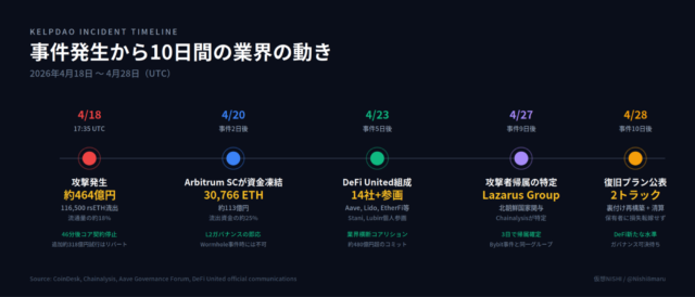 DeFiは今、「事件をどう防ぐか」と同じ重さで、「起きた後にどう処理するか」がプロトコル評価の軸に組み込まれるフェーズに入っている。事件発生からの10日間を時系列で追いながら、何が変わったのか、市場は何を値付けすべきなのかを考察する。