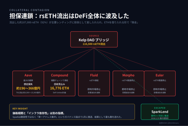 2026年1月29日、AaveはrsETH向けに、担保価値の最大93%までETHを借りられる仕組みを導入した。これは非常に高い借入余地を認める設計であり、rsETHを使った運用需要を強く後押しした。同じ日に、SparkLendはrsETHから撤退していた。理由は、rsETHそのものの脆弱性ではなく、利用が一部のアドレスに集中していたことへの懸念である。結果的に、この判断は正しかったことになる。
