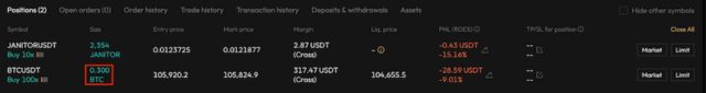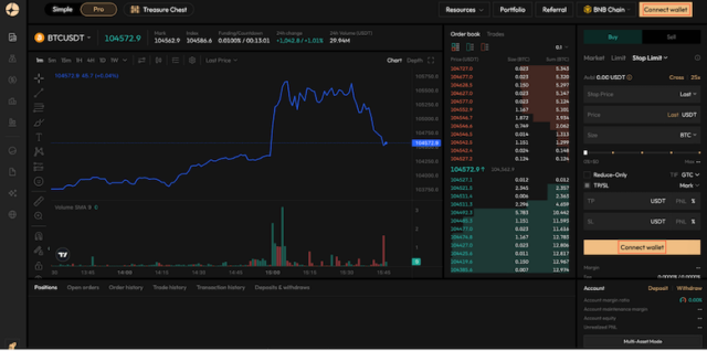 まず、ウォレットをAster Proに接続した後、以下の画像の左上の箇所で、取引する銘柄を選択します。以下のサンプル画面ではビットコインとステーブルコインUSDTのペアが選択されていることがわかります。