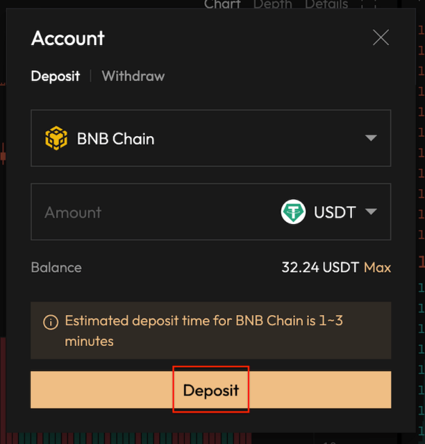 次に「Deposit」、そして「Perpetual account」を選び、BNBチェーン、イーサリアム、ソラナ、アービトラムの中から使用するネットワークを選択。そして、入金したい銘柄を選択し、数量を入力して、トランザクションを承認します。