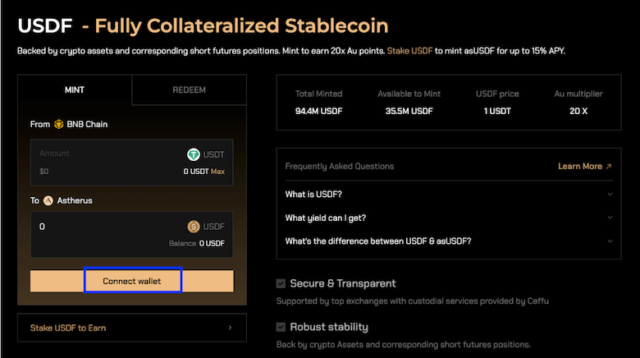 Asterは、分散型の米ドルステーブルコイン「USDF」も提供しています。USDFは保有者に利回りを提供できるように設計されていることが大きな特徴です。公式サイトによると、最大で年間15%の利回りを提供できるように目指しています。