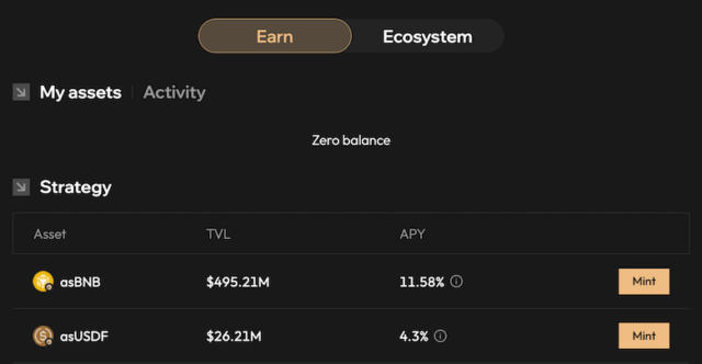Asterには「Aster Earn」というプロダクトもあります。Aster Earnは利回りに特化しており、asUSDFも構成プロダクトの1つです。