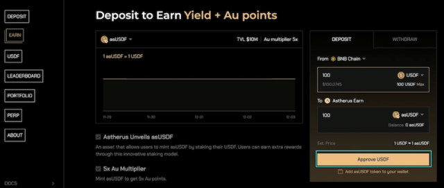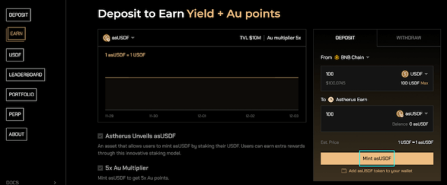 続いて、利回りを獲得するためにUSDFをステーキングして、asUSDFを発行します。まずは「Aster Earn」のウェブページにアクセスし、発行する銘柄としてasUSDFの横の「Mint」を選択。