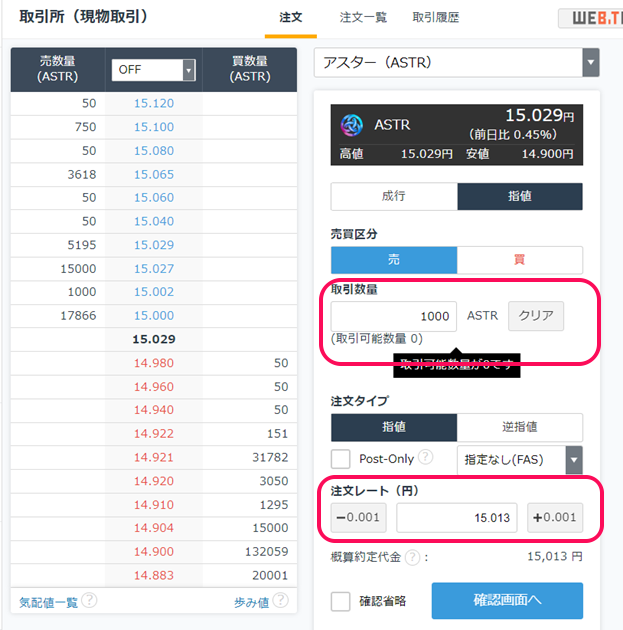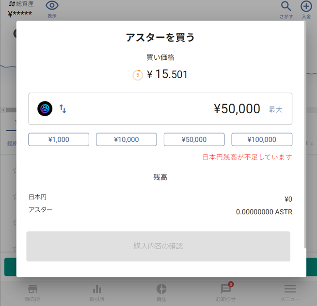 入金後、自身の口座に円の残高が反映したら、その資金を使ってアスターの購入が可能。取引所か販売所を選んで、必要事項を入力して購入手続きを行います。
