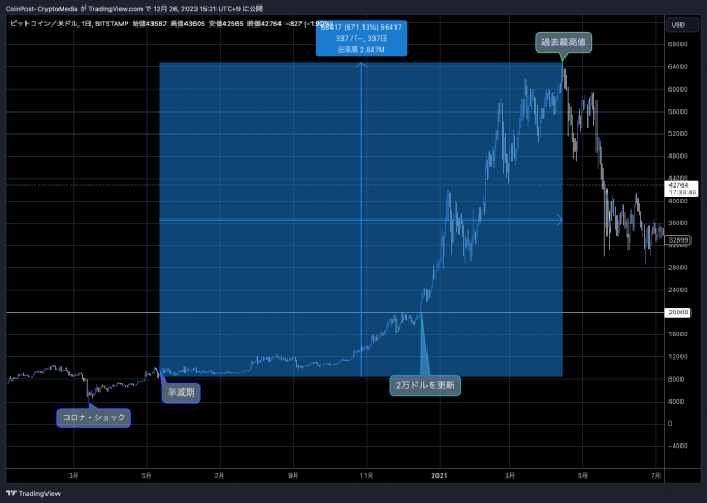 その後、2017年の仮想通貨バブルを経て、年末にはBTC価格が20,000ドルに達しました。