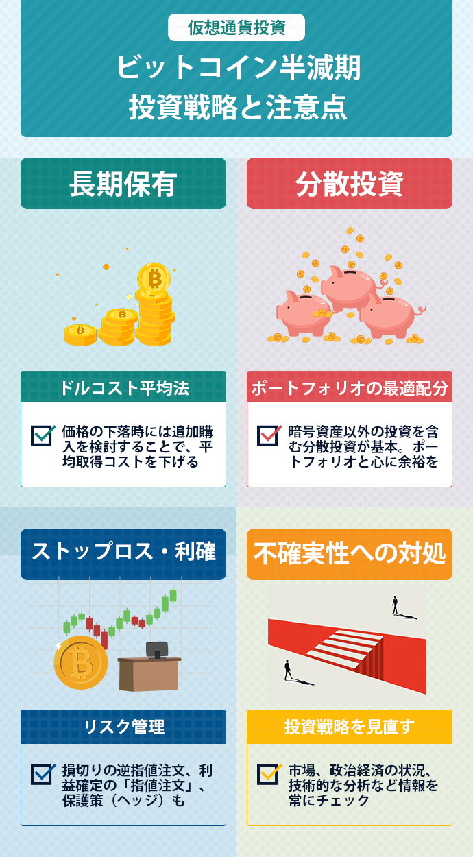 市場の動向、政治経済の状況、技術的な分析などに基づいた情報を常に追跡し、投資戦略を柔軟に調整することが重要です。特に、半減期のような重要なイベントの前後では、市場のセンチメントが大きく変化する可能性があります。