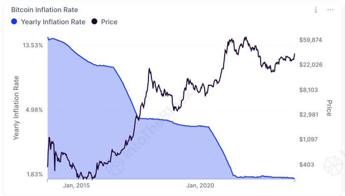 ビットコインはこれまでに4回の半減期を経験し、それぞれの後に新たな最高値を記録してきました。2021年時点でのビットコイン供給の年間インフレ率は1.8%に低下しましたが、2024年の半減期ではこのインフレ率がさらに0.86%へと低下します。