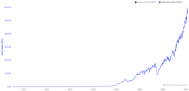歴史的時に上昇傾向を維持するBTCハッシュレート 出典:Blockchain.com