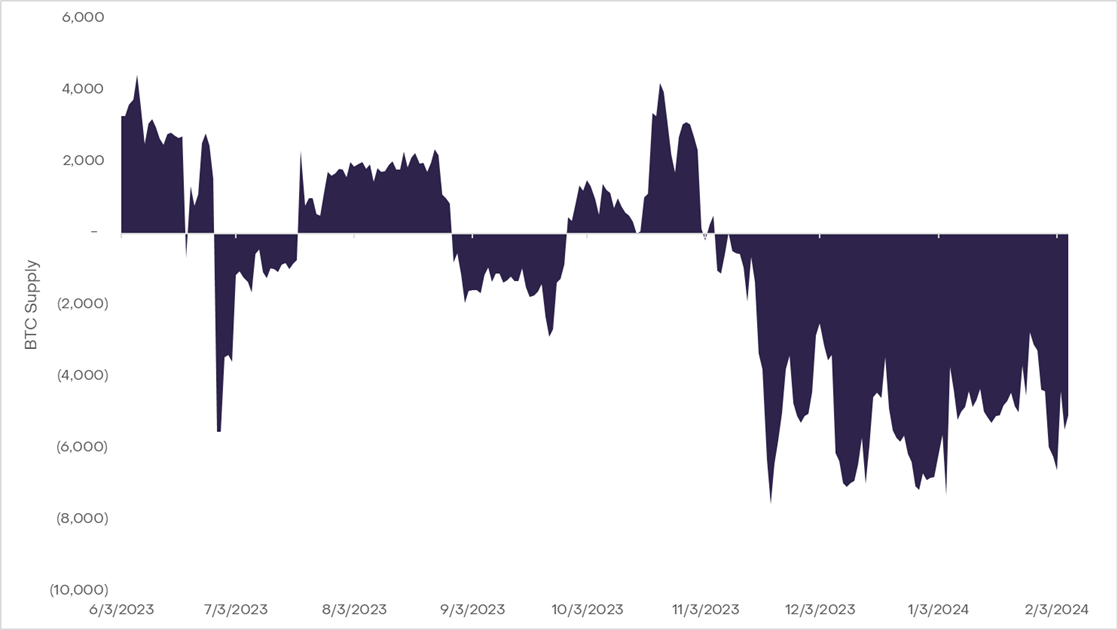 マイナーのネットポジションの変化(マイナーのアドレスに保有されるビットコインの30D変化)出典 Glassnode、2024年2月7日現在