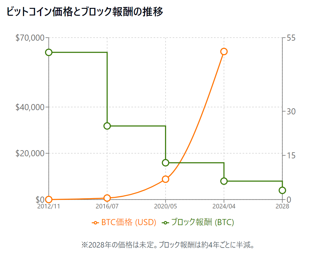 半減期とは、ビットコイン(BTC)のネットワークを維持するため、ブロックを生成するマイナー(採掘業者)に支払われる「マイニング報酬」が半分になるイベントです。