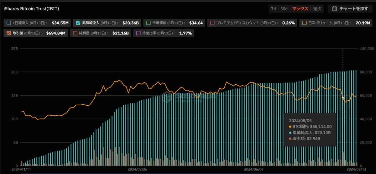 特に、米資産運用会社ブラックロックのビットコインETF「IBIT」は、8月13日時点で約34万BTCを保有し、ビットコイン保有ウォレットとして世界第3位の規模を誇ります。1月から8月までの7か月間で平均毎月約49,681BTCが流入しており、IBITの累計純流入額は約205億ドル(約3兆円)に達しています。
