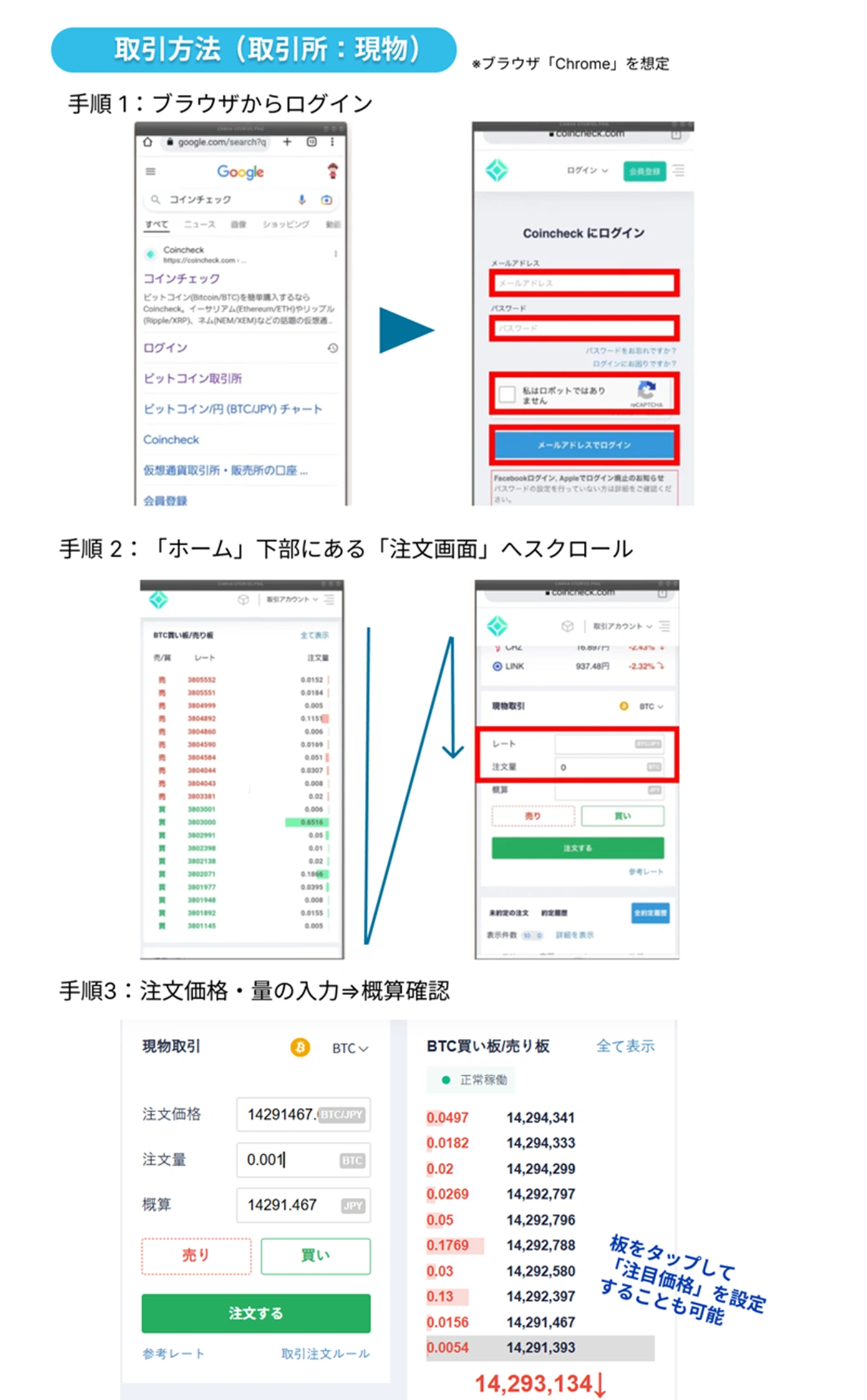 ブラウザの場合:ChromeやSafariでCoincheckにログイン → 「ホーム」に設置された取引所画面へ - 価格と数量を入力