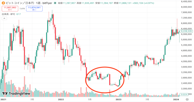 2021年11月の約770万円を最高値として、2022年11月には約220万円まで下落しました。下落率は約71%。背景には、ステーブルコインTerraUSDの崩壊に端を発するLUNAショック、米FRBによる急速な利上げ、そして11月の大手取引所FTX破綻という「業界最大級の信用ショックの連続」がありました。特に時価総額数兆円規模のLUNA/USTが事実上ゼロ近くまで暴落したことは、業界全体の信頼を大きく損ない、機関投資家を含む多くの参加者が市場から撤退するきっかけとなりました。