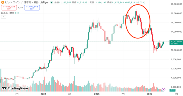 | 2024年〜 | 約1,880万円(2025年10月) | 約1,070万円台(2026年2〜3月頃) | ▲43% | 調整中(2026年4月現在、約11,500,000円台前後で推移) | —(未更新) |