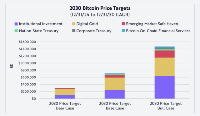 米投資会社ARK Investmentは最新レポート(5月24日)で、2030年のビットコイン価格を30万ドル・71万ドル・150万ドルの3段階で予測しました。