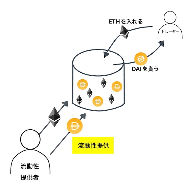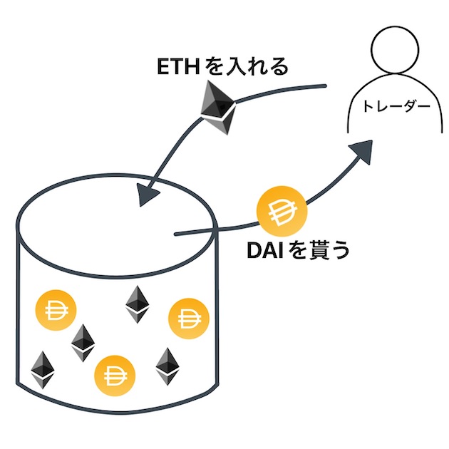 例えば、ETH/DAIのプールがあったとします。このプールには、あらかじめETHもDAIも両方用意されています。持っているETHをDAIに交換したい場合、このプールの中に自分のETHを入れ、代わりに相当数のDAIをプールから貰います。これでトレードが完了です。