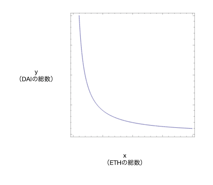 前述のETH/DAIプールの例に即してみると、xはプール内のETHの総数を、yはDAIの総数を表しています。そしてkは定数なので、ETHの総数とDAIの総数の積は、常に一定であるということを意味しています。