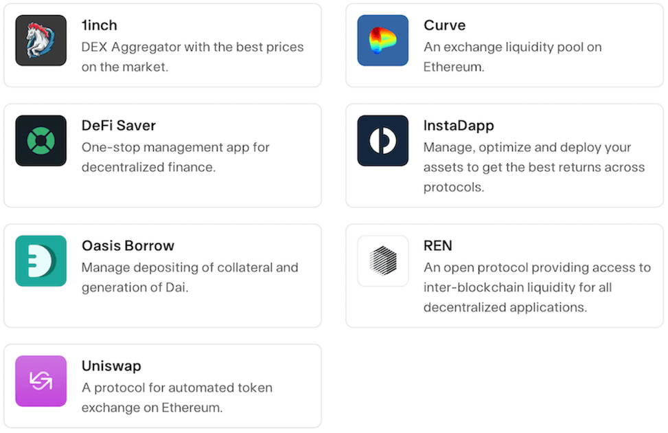 この他にもDaiは、構成可能性(Composability)の高いイーサリアム・ブロックチェーンを基盤としているため、他のDeFiサービスおよびプロダクトへ容易に統合可能だというメリットもあります。Daiは様々なDeFiアプリケーションに統合されています。以下は、その一例です。