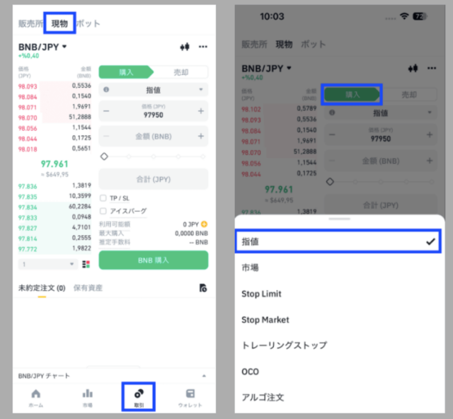 - 成行注文:今すぐBNBを購入したいとき。市場価格で即時に約定します。