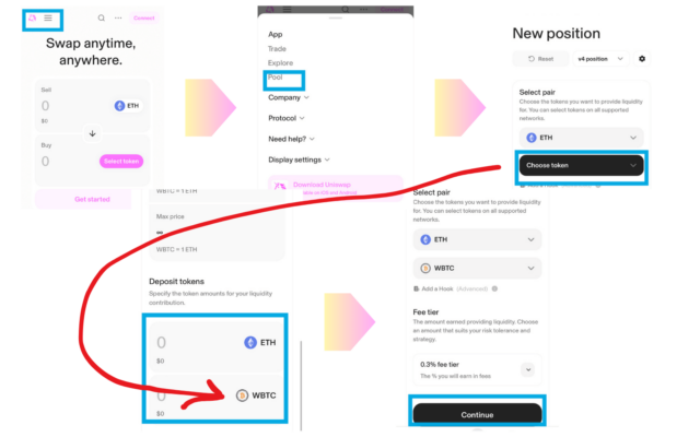 - 「Pool」画面で「WBTC/ETH」などの通貨ペアを選択