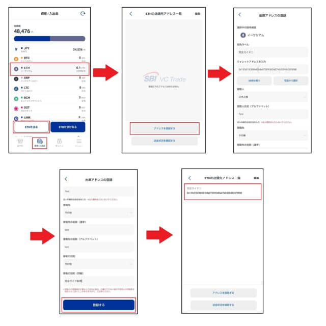 - 「アドレスを登録する」をタップし、MetaMaskでコピーしたETHの受信アドレスを登録