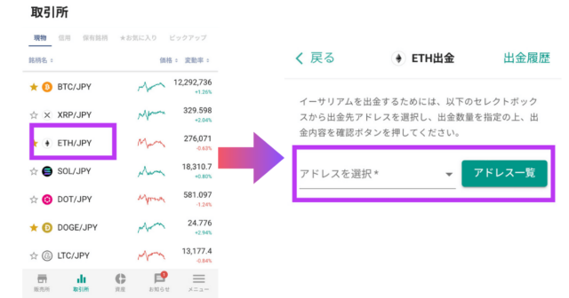 - メタマスクのアドレスを送金先として登録し、ETHを出庫